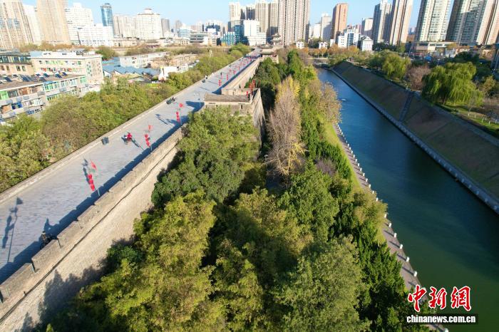 11月24日,陕西西安,冬季温阳停的乡墙根,市平易近们集合正在此戚忙文娱。图为乡墙1角。(无人机相片)中新社记者 弛遥 摄