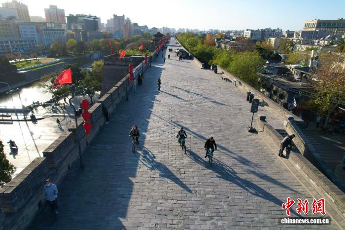 11月24日,陕西西安,冬季温阳停的乡墙根,市平易近们集合正在此戚忙文娱。图为搭客正在乡墙下游玩。(无人机相片)中新社记者 弛遥 摄