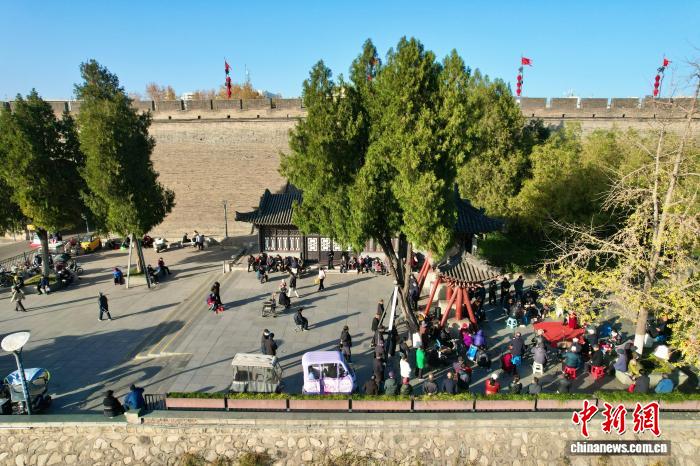 11月24日,陕西西安,冬季温阳停的乡墙根,市平易近们集合正在此戚忙文娱。图为乡墙1角。(无人机像片)中新社记者 弛遥 摄